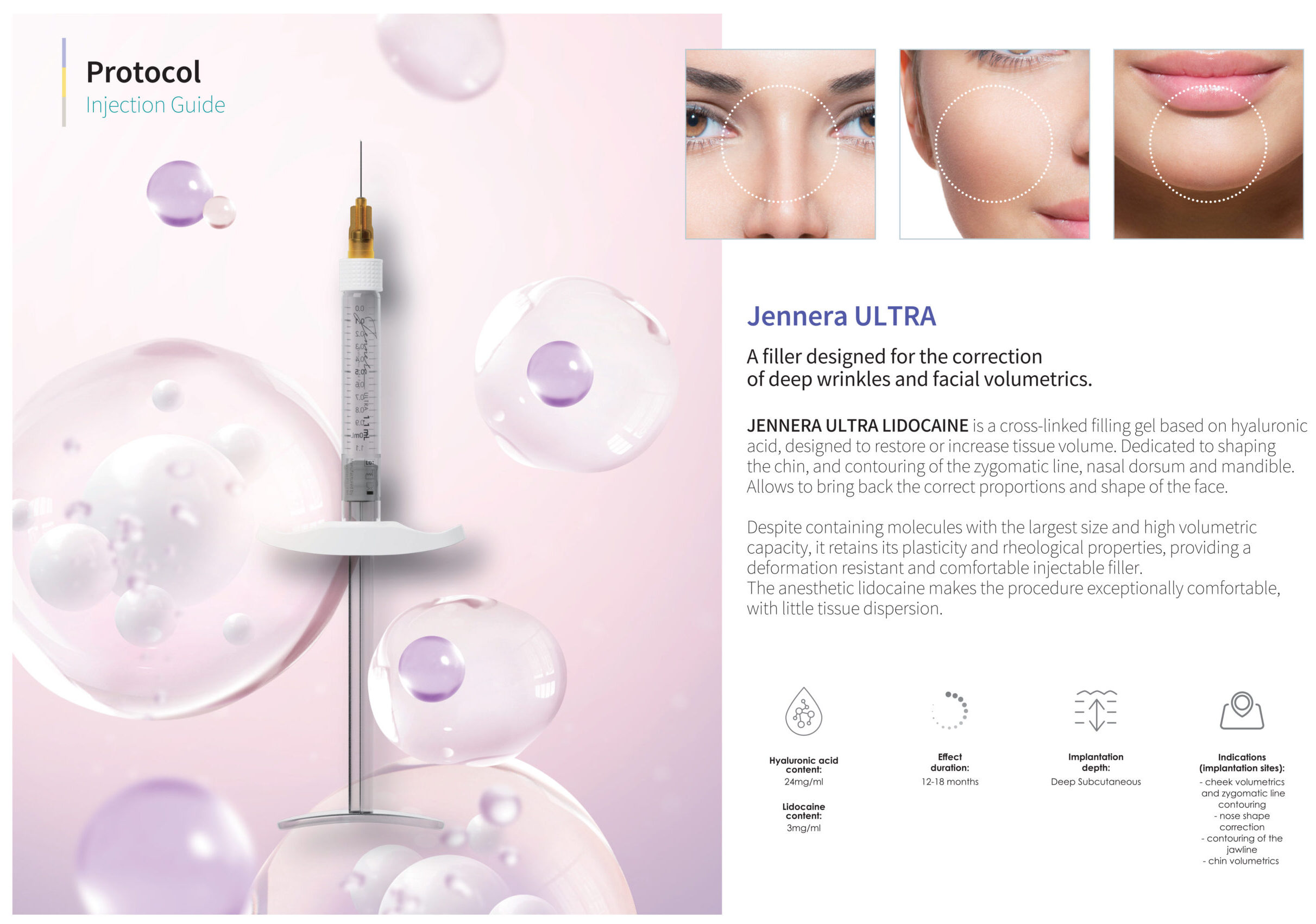 JENNERA ULTRA LIDOCAINE is a cross-linked filling gel based on hyaluronic acid, designed to restore or increase tissue volume. Dedicated to shaping the chin, and contouring of the zygomatic line, nasal dorsum and mandible. Allows to bring back the correct proportions and shape of the face.