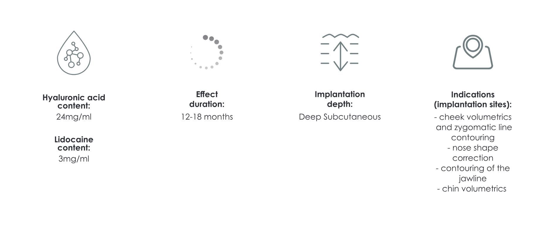 A filler designed for the correction of deep wrinkles and facial volumetrics.